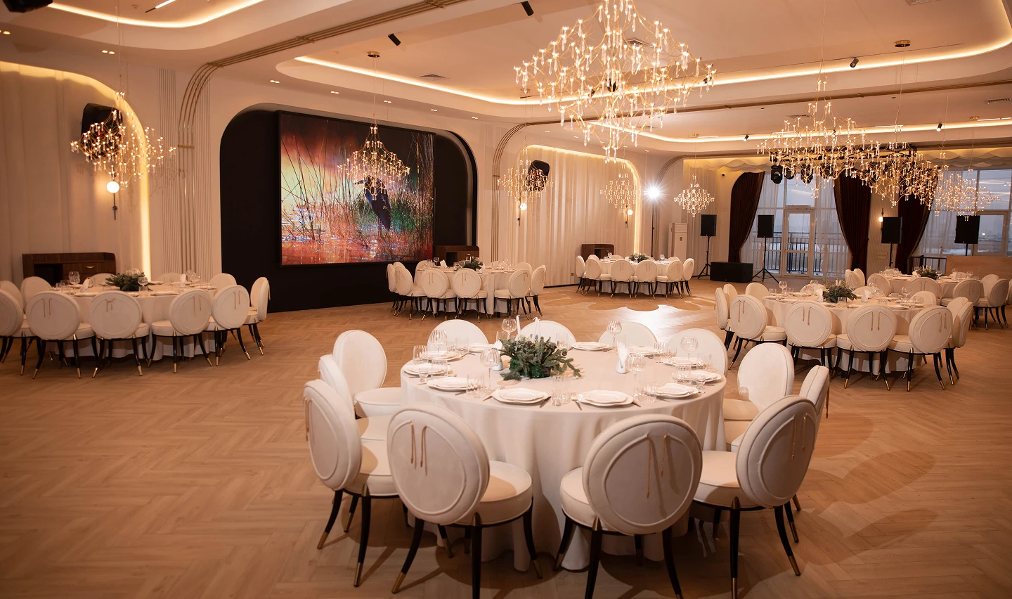 В комплексе AGUGAI представлены банкетные залы разной вместимости и формата — для свадеб, банкетов, корпоративов и частных мероприятий, с возможностью подобрать оптимальное пространство под количество гостей и формат события.